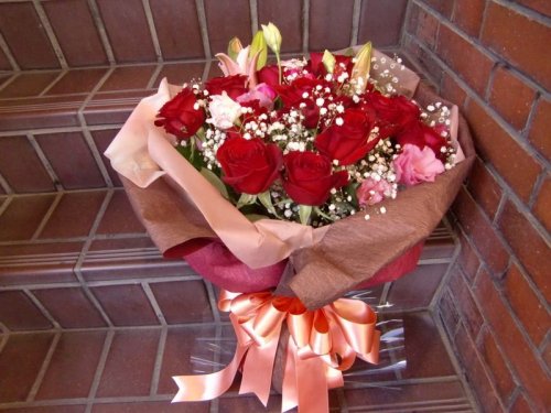赤薔薇とカスミソウのお花束です。薔薇の種類は色々とご用意しておりますのでお気軽にお問い合わせください。
