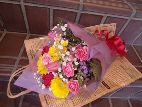 ご送別などに一番よく使われるサイズです。リーズナブルでボリュームがあり、華やかです。お持ち帰りの袋をお付けしています。ご予約の際、男性用か女性用か言っていただくと、ラッピングのお色など、気をつけます。