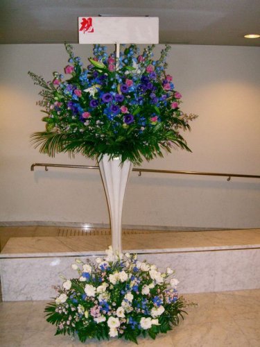 陶器鉢に 生けこんだ大きなアレンジメントを並べてロビーを飾ります。季節感が出て、ロビーや、催し会場前などを華やかにします。
